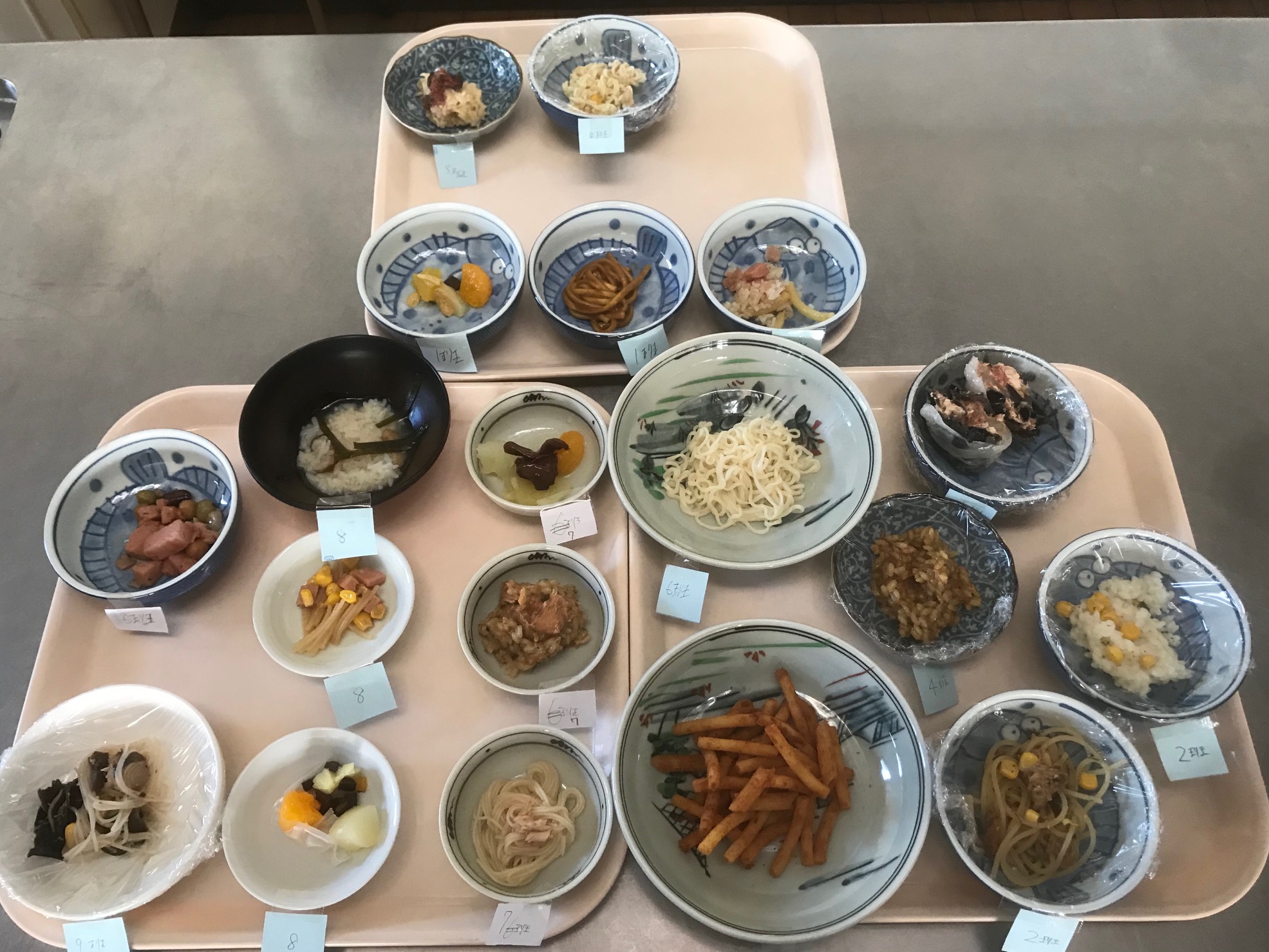 少ない水での茹でものやカセットコンロでの加熱など、最初は慣れない様子でしたが、みんなで作業を分担してほとんどの班が、調理時間40分で2~3品作り上げていました。