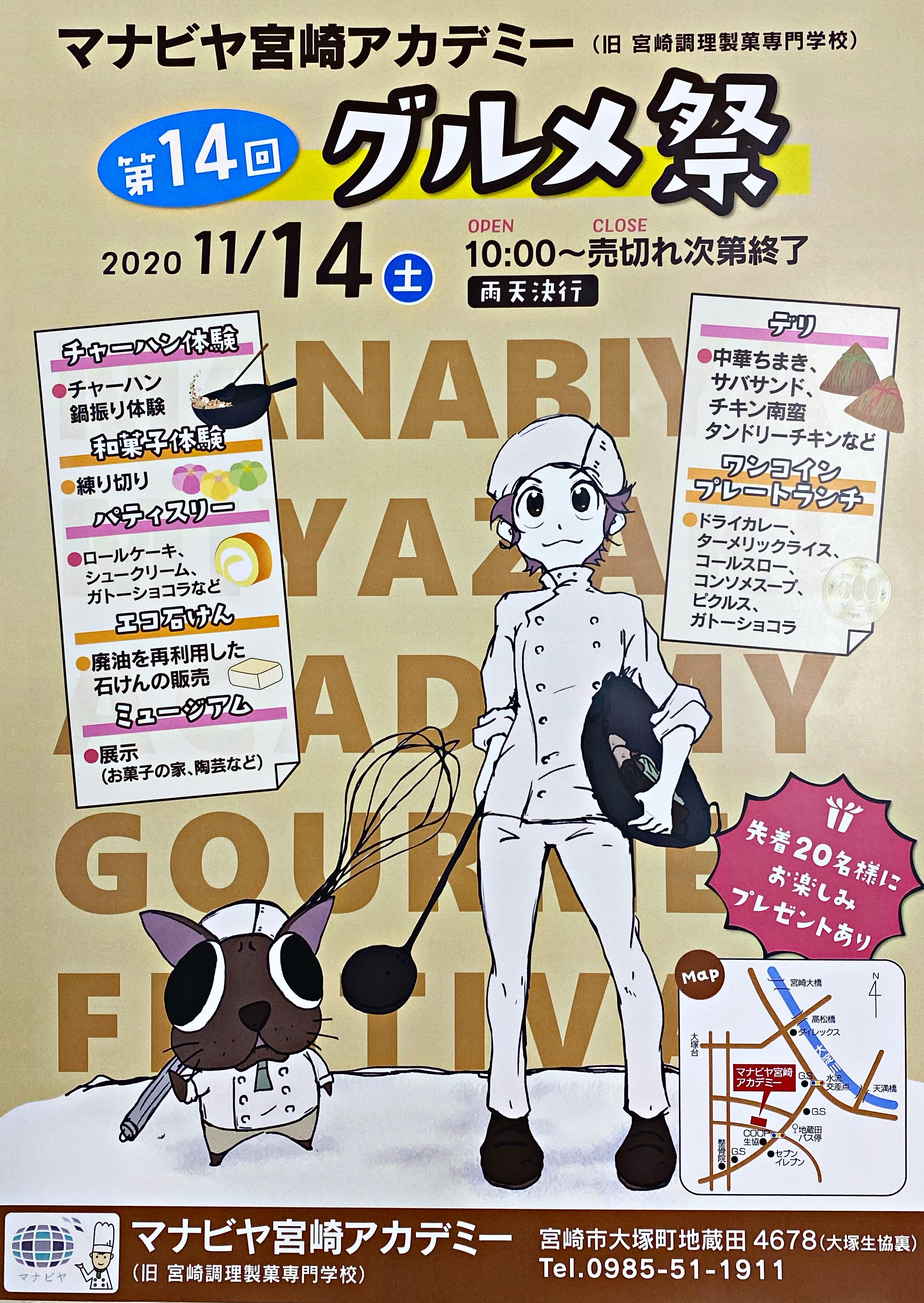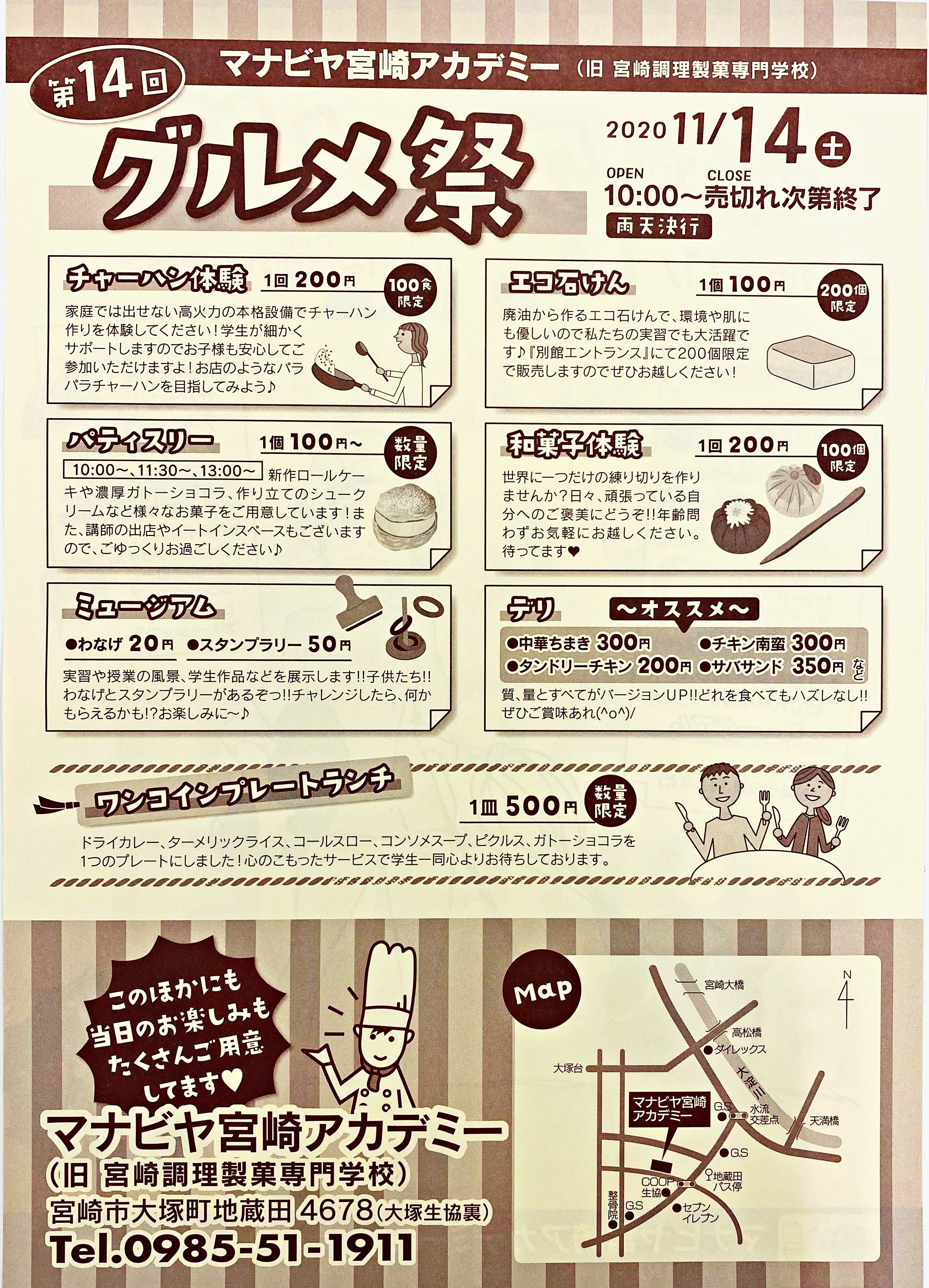 毎回好評を頂いている、年に一度の『グルメ祭』ですが、今年度は11月14日(土)に開催! ※雨天決行今年4月から校名を変更し、日々様々なバージョンアップを図っており、学園祭も例外ではなく、より満足いただける催しを計画しております。美味しく楽しい『グルメ祭』へ是非お越しくださいね。たくさんのご来場お待ちしております♪※当日は新型コロナウイルス感染症対策として検温、マスク着用等のご協力をお願い致します。