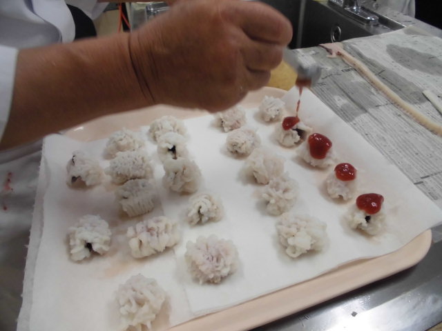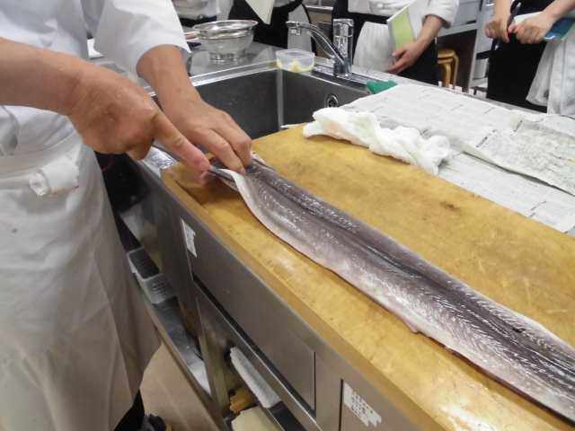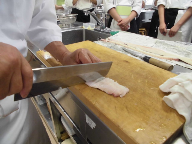日本料理実習にて、高級食材の鱧(はも)をさばきました。鱧には無数の骨があり、専用の包丁にて「骨切り」という熟練の技を見て感動!そして、鱧の上品な味に感激の実習でした~!