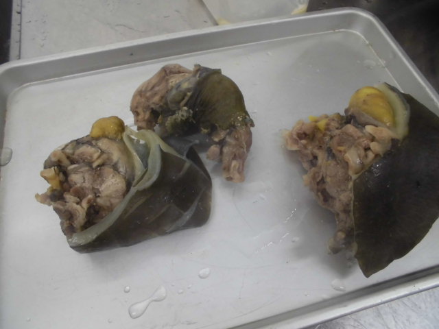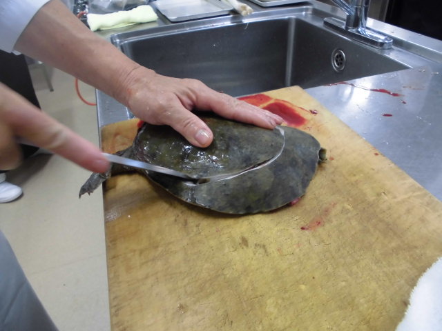 日本料理実習にてスッポンをさばきました。イケメンA君「わぁ~!! オレ見るの無理や~!!」先生「何言いよるとか~! しっかり見ちょかんか~!!」と、活かしのままさばかれるスッポンを目の前に、衝撃的な様子の学生でしたが、その後、お吸い物として美味しくいただきました。見るの無理―!と言ってたA君「てげ旨い!! 先生、おかわりしてもいいですか?」命をいただくを実感した実習でした。合掌。