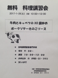 食肉料理講習会募集。*メニュー 『牛肉とキャベツのXO醤炒め』 『ポークソテーきのこソース』*日 時 2017.1.28(土)10:00~12:00(受付9:30~)*場 所 マナビヤ宮崎アカデミー*定 員 30名*お申し込み方法 ℡0985-51-1911(マナビヤ宮崎アカデミー)*主 催 宮崎県食肉事業協同組合定員に達し次第、募集を終了させていただきます。人気の講習会ですので、お申し込みはお早めにどうぞ。