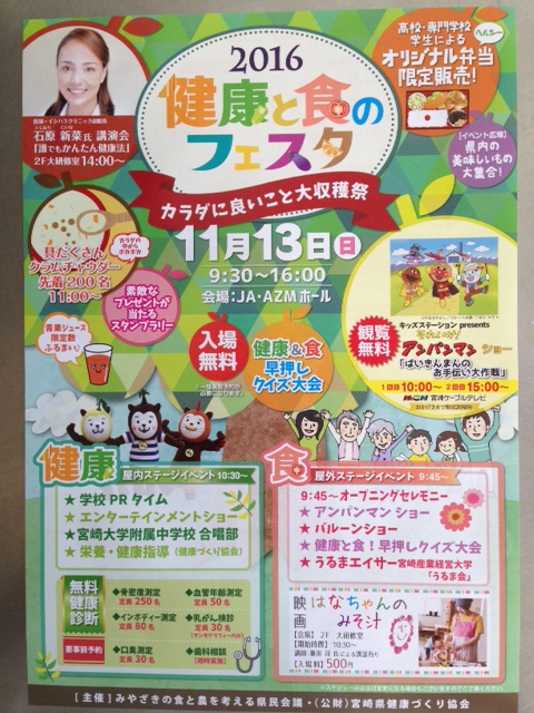 11月13日(日)9:30~JAアズムホールにて、『健康と食のフェスタ』が開催されます。当校も、高鍋農業高校様とのコラボで“オリジナル弁当”や、“野菜スイーツ”を販売いたしますので、お時間のある方は足をお運びください。宮崎県産の食材がギュッと詰まったお弁当(600円)やお菓子(各種)を是非ご賞味ください。