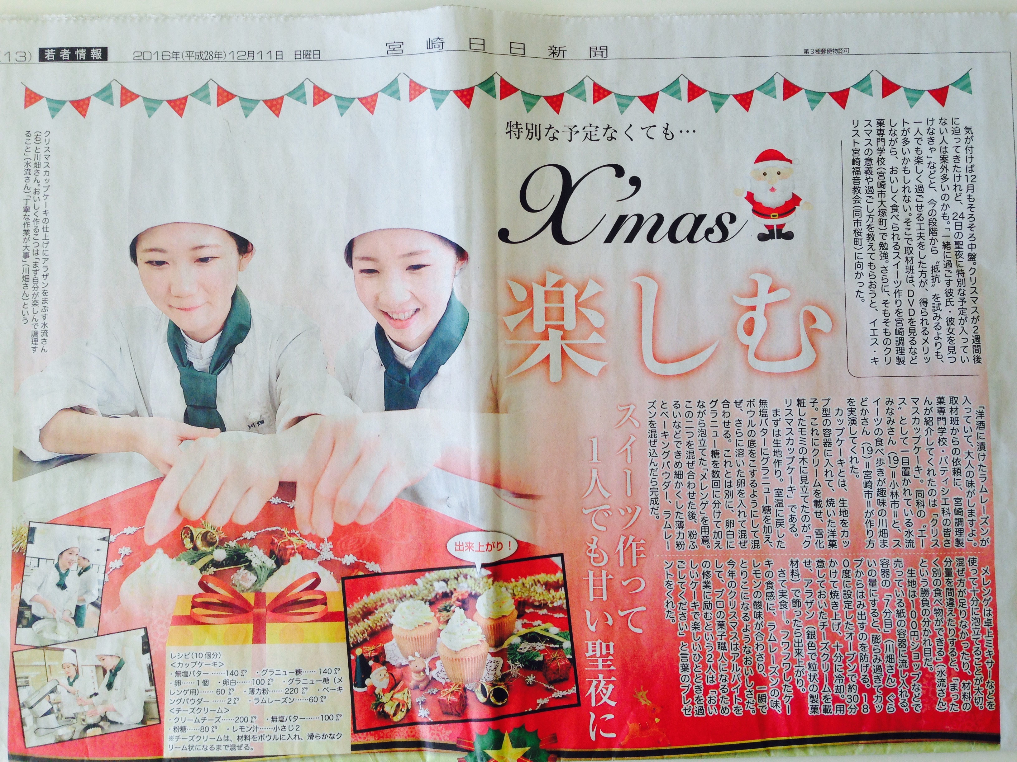 パティシエ科の学生が、X’masを楽しむ方法として、手軽に作れる「カップケーキ」のご紹介をしてます。12月11日宮崎日日新聞掲載分です。