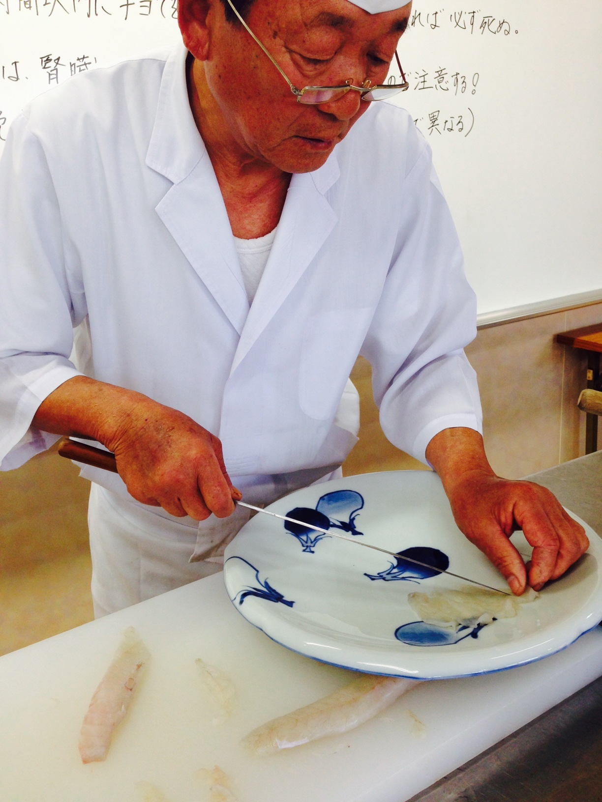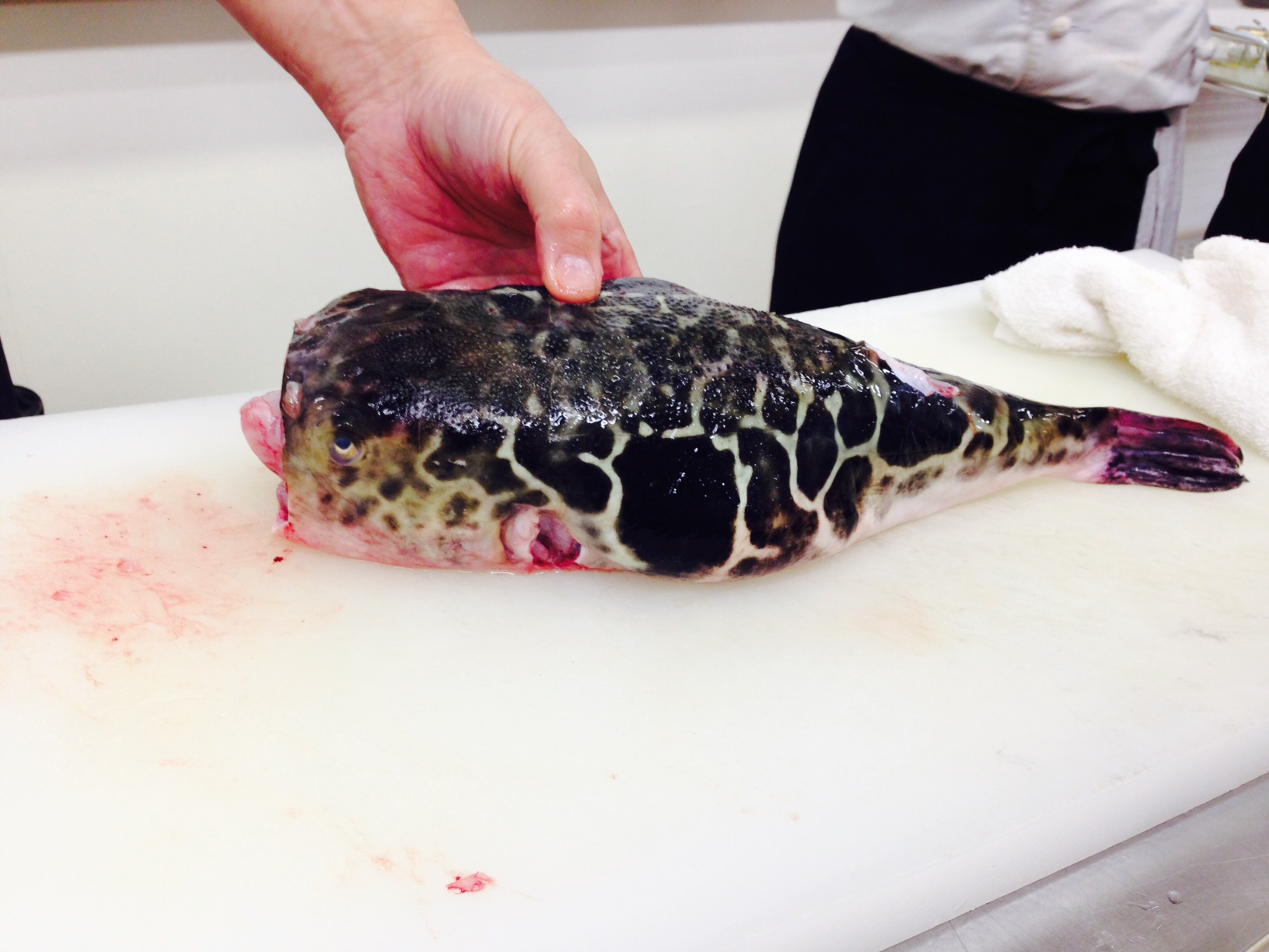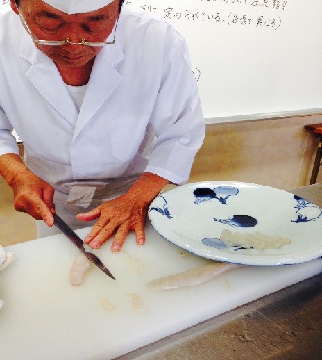 職人技はカッコいい~!!調理師科1年生最後の日本料理実習は、毎年恒例『トラフグさばき・薄造り』のデモンストレーション!プロの技に学生達は見入ってました。中には、自分もいつか先生のように河豚処理師の免許を取りたい!と思った学生もきっといるかもしれません。薄造りを試食した学生は、初めて食べる河豚に感動してました~♪