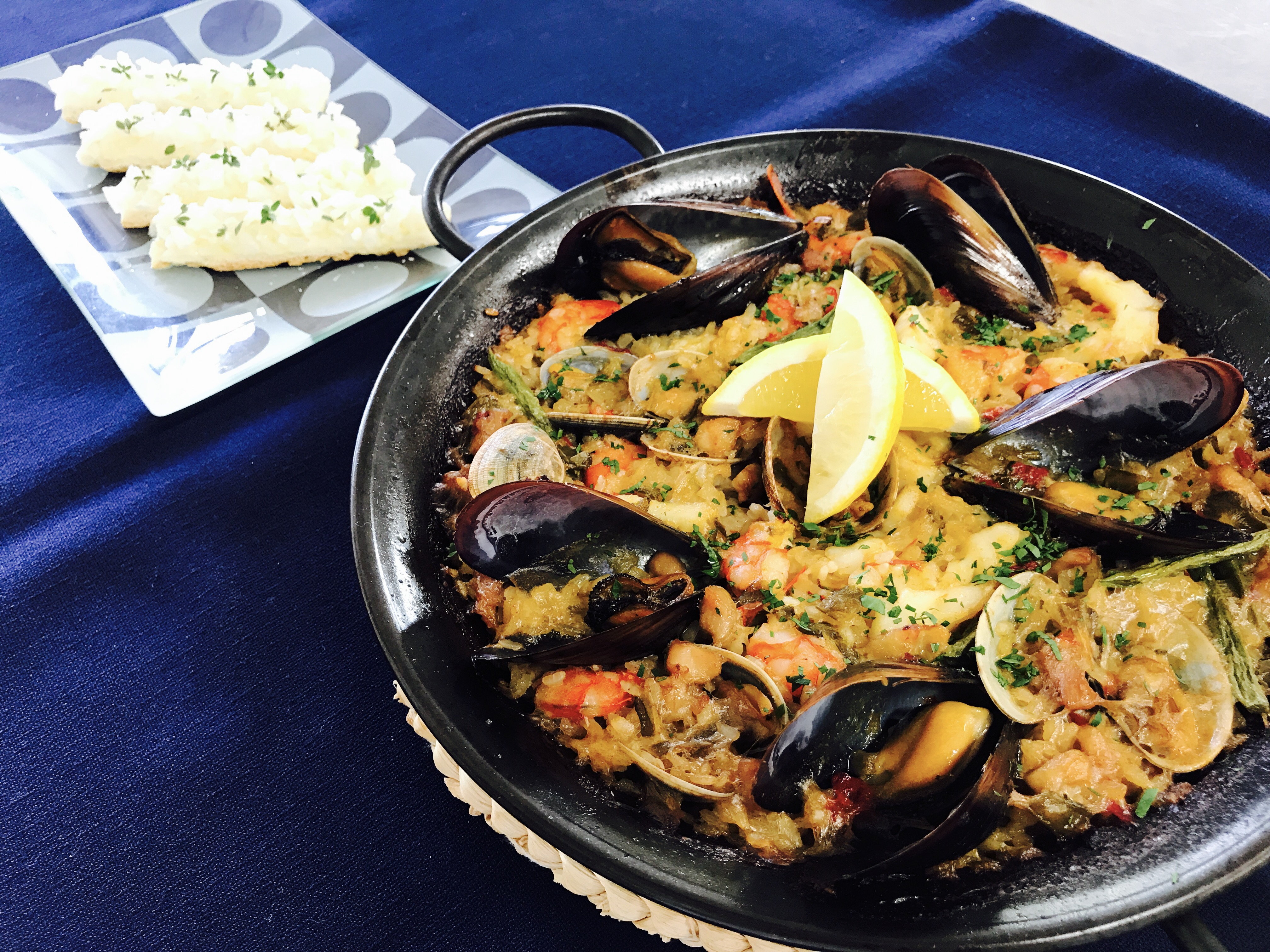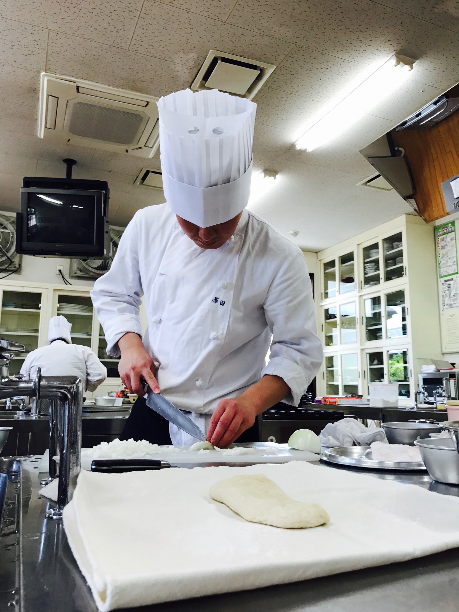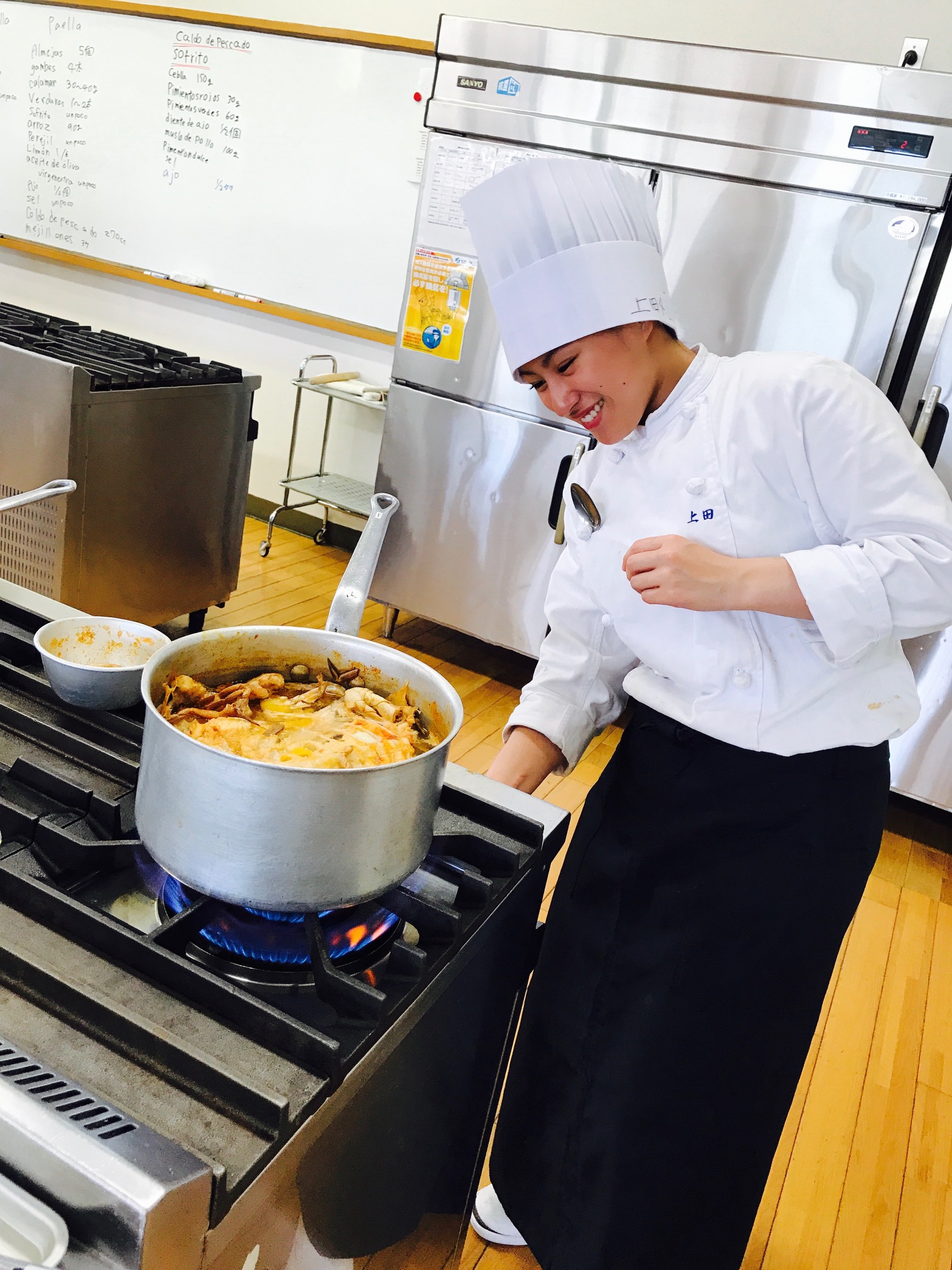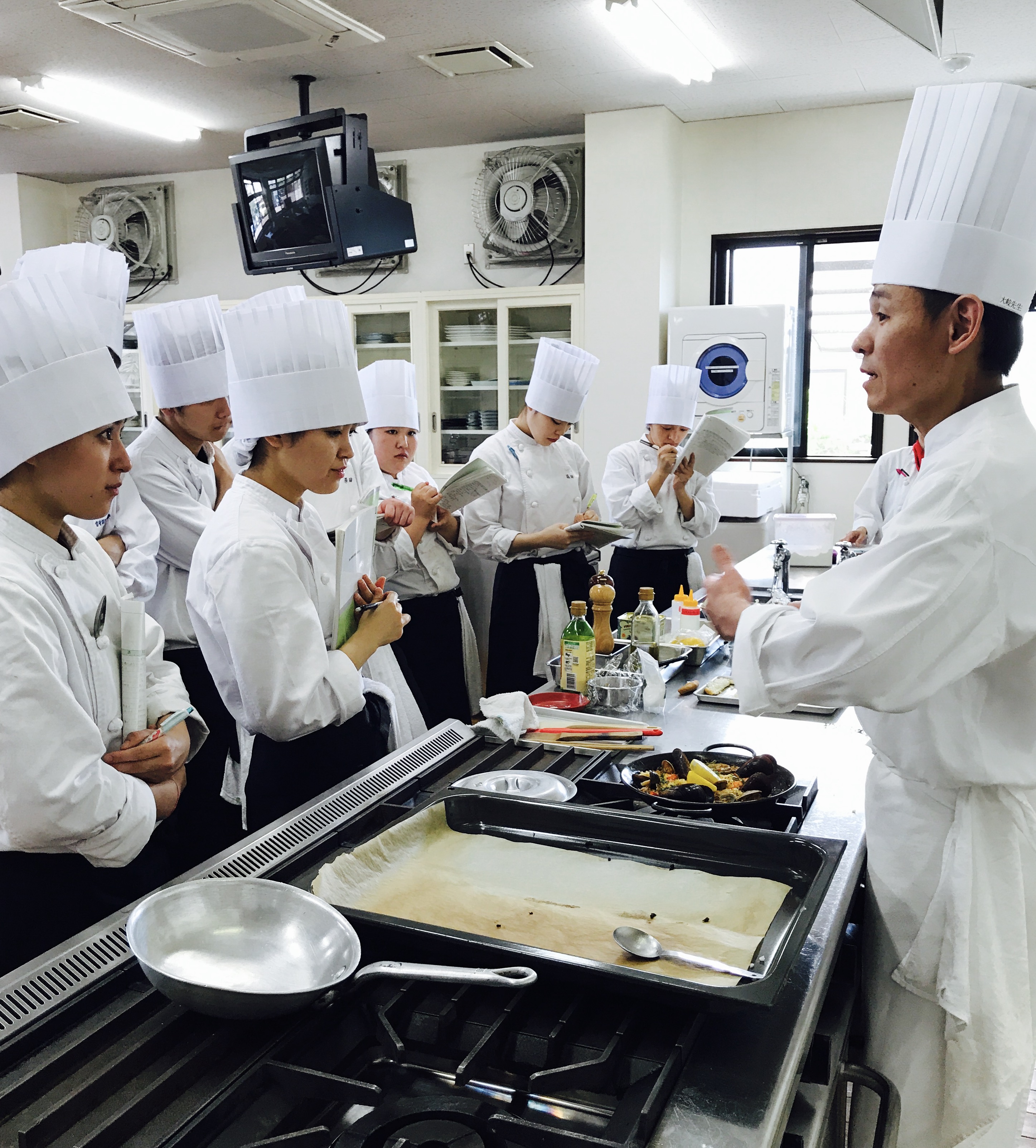 調理師科2年生の実習風景。昨年1年間の基礎技術が身についていて、どんな作業も手際よくこなしております~!!本日は、『パリサンク』オーナーシェフ大岐先生によるスペイン料理実習。【メニュー】* 魚のだし取り(カルロデ・ペスカド)* パエリヤ* 新玉葱のパン(コカ・デ・セボォリャ)