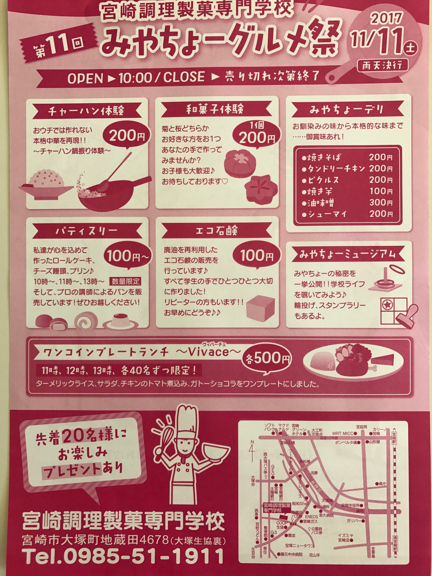 手作りのお菓子やパンの販売、調理体験(チャーハン)やワンプレート500円ランチなど心躍る内容となっております。美味しく楽しい『みやちょーグルメ祭』へ是非、お越しくださいね。