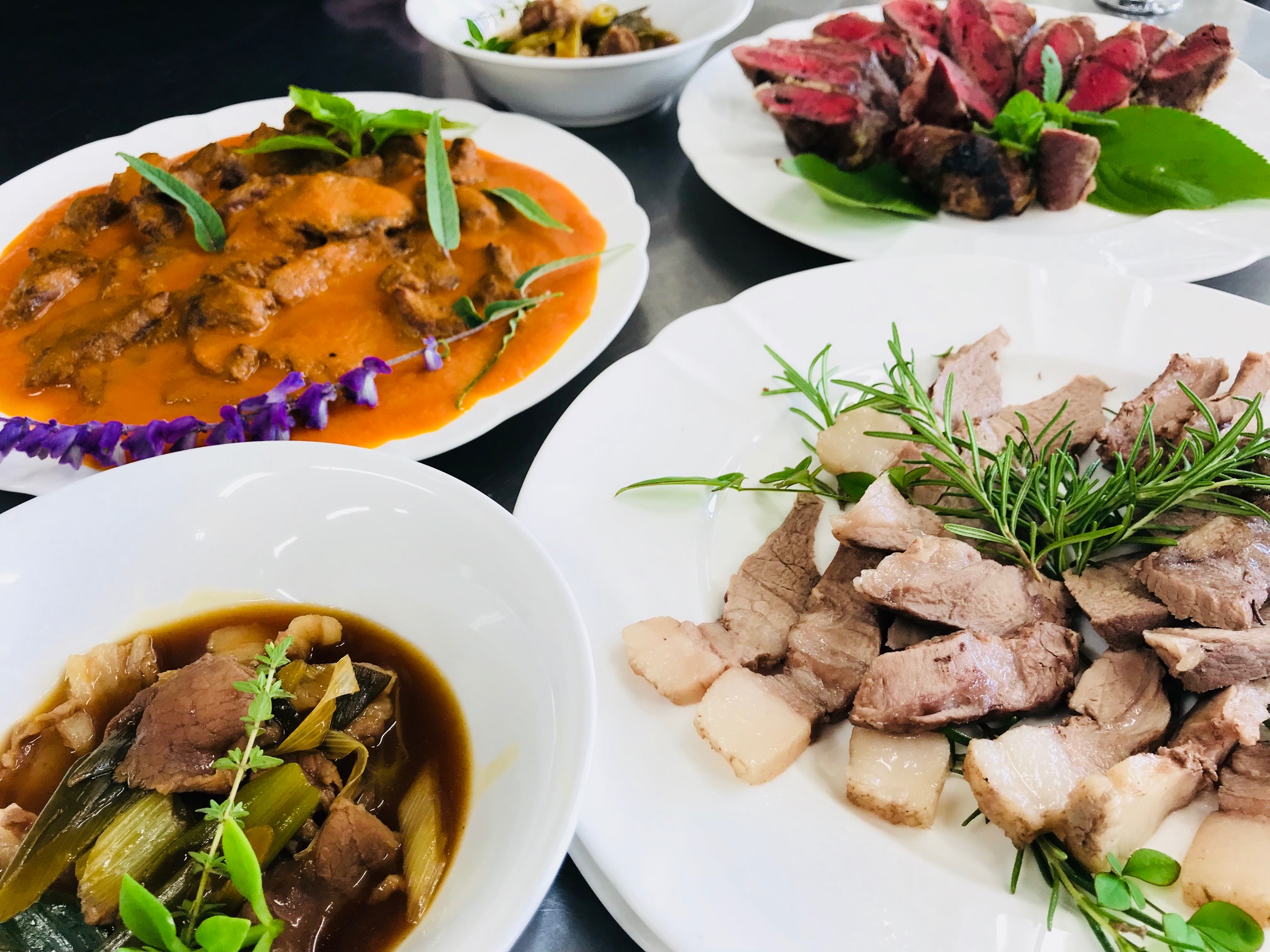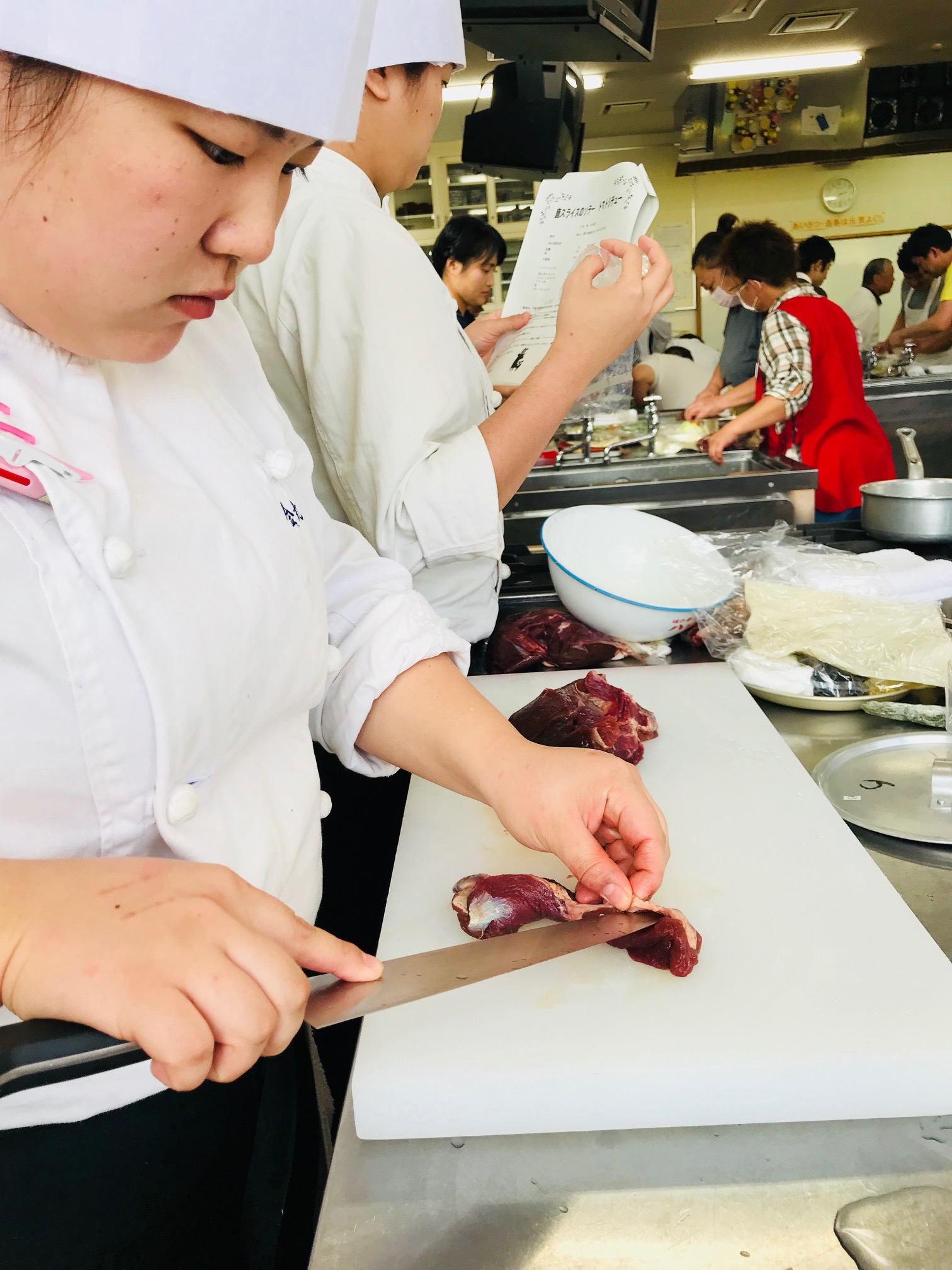 10月23日に宮崎県主催で日本ジビエ振興協会 藤木徳彦理事長の講師のもと、ジビエ料理講習会が当校で行われました。県内の料理人や狩猟関係の方々を対象とした講習会ではありましたが、当校からも2年生が参加させていただきました。プロの料理人に混じっての調理でとても緊張していましたね(笑)