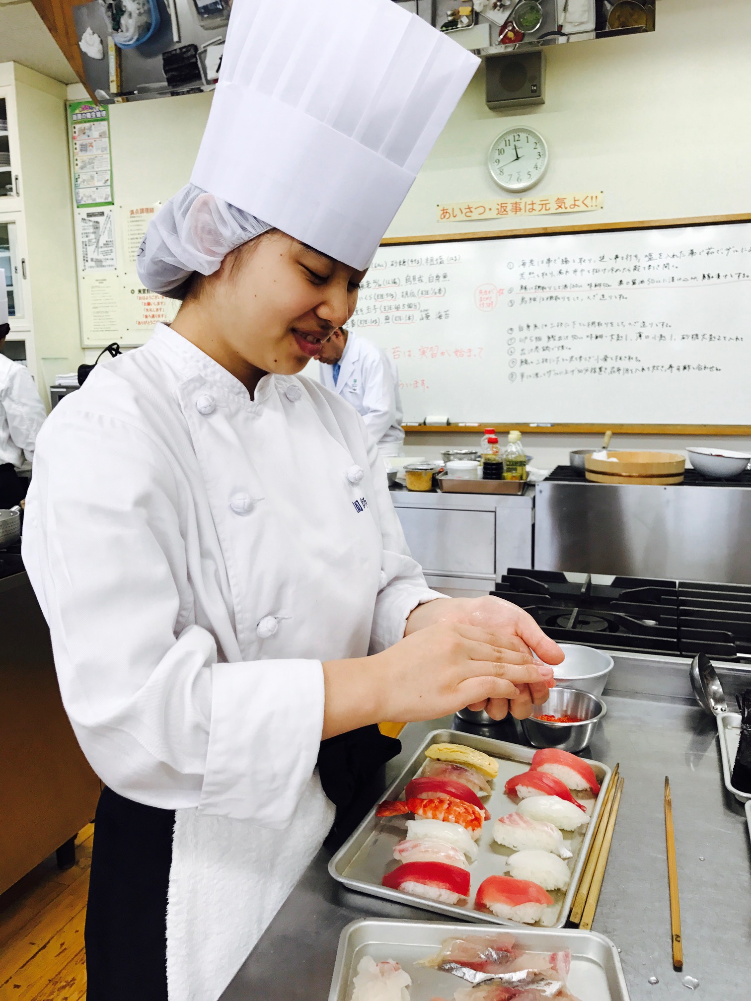 とある日の1年生の日本料理実習。この日の実習は『握り寿司』でした!「食べるのは大好きだけど握るのは初めて」という学生が多かったのですが、先生方の丁寧な指導もあり、最後には私もついつい手を伸ばしたくなるような立派な仕上がりになっておりました(*^0^*)12月に控える校内寿司コンクールもがんばれー!!