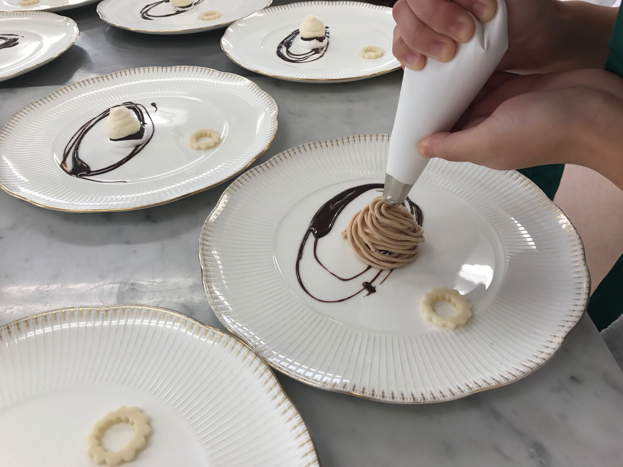 皆さんは秋の定番スイーツといったら何を思い浮かべますか?本日のパティシエ科の実習は、この季節にぜひとも食べたい『モンブラン』でした!モンブランのクリームをうまく搾り出すのはとても難しいんですよ(;^_^