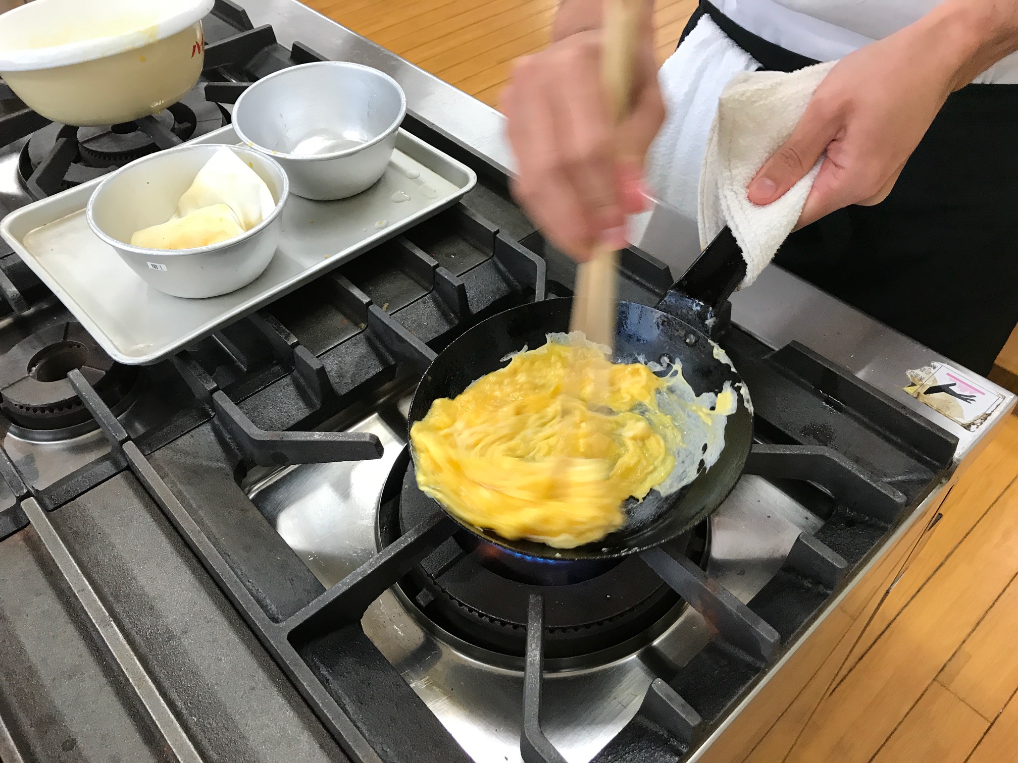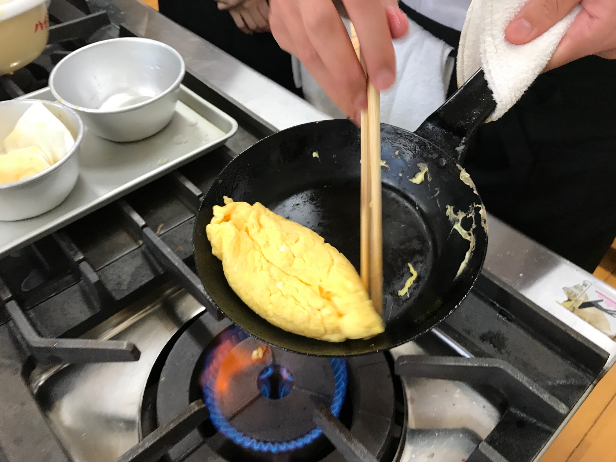 数日前の放課後、香ばしくほんのり甘~い香りが漂ってきました。その香りを辿って行くと学生が『オムレツ』の練習を行っていましたよ!一生懸命に努力を重ねる学生に元気をもらいました!!ガンバレー(o^-')b