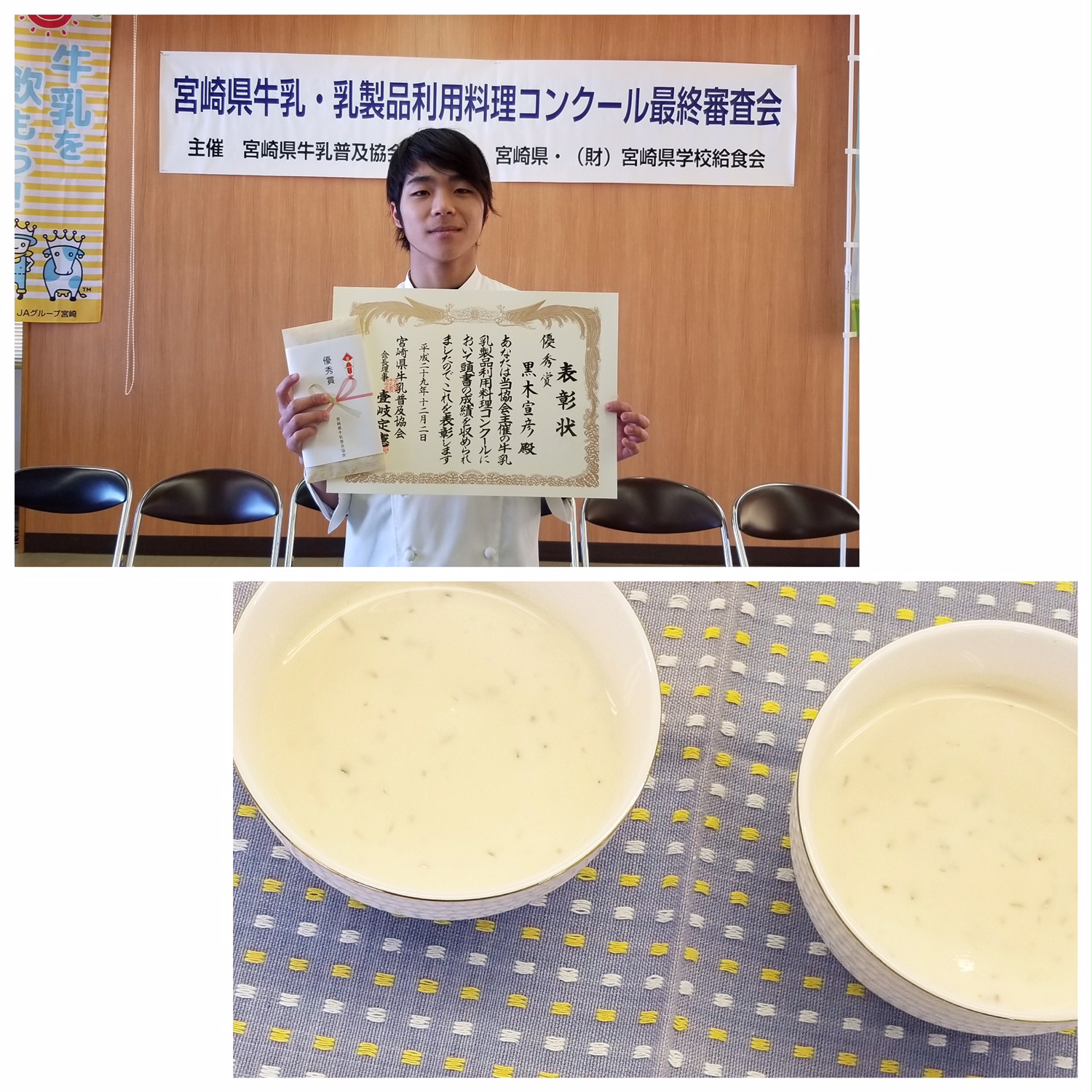 12月2日、宮崎県牛乳普及協会主催の『宮崎県牛乳・乳製品利用料理コンクール最終審査会』が行われ,本校からは2名の学生が出場しました!!そして見事、最優秀賞に伊藤美咲さん(1年生)、優秀賞に黒木宣彦くん(1年生)が選ばれました!!おめでとうございます!!