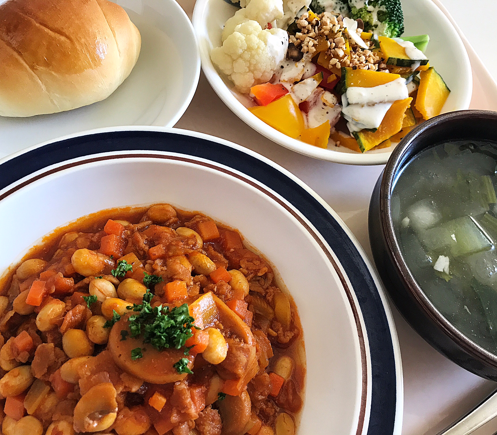 3学期最初の給食です♪メニューは『ポークビーンズ』『温野菜のサラダ』『ほうれん草と冬瓜のスープ』『バターロール』でした!彩りがきれいで楽しく頂きました(´∀`)b