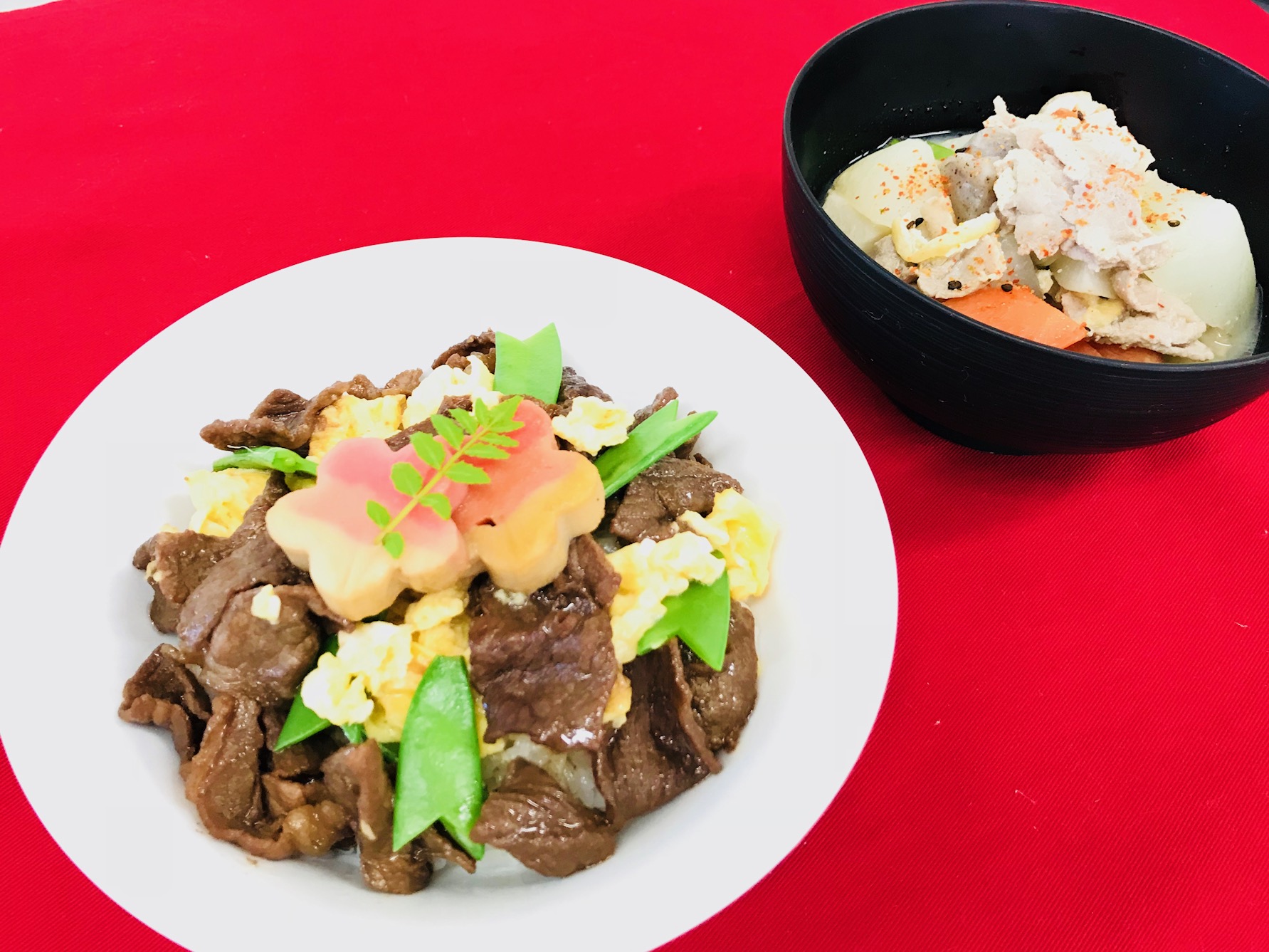 1月13日(土)、当校にて毎年ご好評をいただいております、宮崎県食肉事業協同組合様主催の料理講習会が無料で行われました。今回は、宮崎県産の食肉をふんだんに使用した『しぐれ煮の小丼 ひな祭り仕立て』と『ボリューム豚汁』の2品を作りましたよ(*^^*)