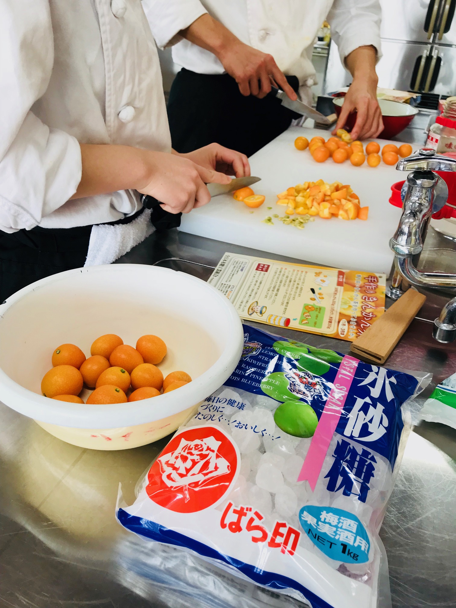 1月19日(金)に全日本氷糖工業組合の三原氏による「手作りきんかん茶講習会」が授業で行われました。砂糖のお話し(上白糖と氷砂糖の違いなど)や、きんかんについてのお話しなどをして頂き、実際にきんかん茶に使用するきんかんシロップの製作を行いました。今が旬のきんかんで作ったきんかん茶は香り豊かでとってもおいしかったですよ(*´∀`*)<協力>全日本氷糖工業組合石塚硝子株式会社JA宮崎経済連 園芸販売課