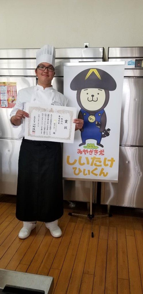 2月3日(土)に宮崎県主催の「しいたけ料理コンクール」が行われました。当校からは書類審査を通過した5名が出場しました。そして見事、穂満 啓太くんが最優秀賞に選ばれ全国大会の切符を手にしました!!全国大会でも存分に腕を揮ってください(^^)b