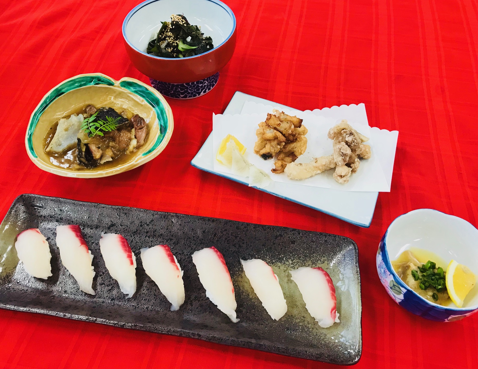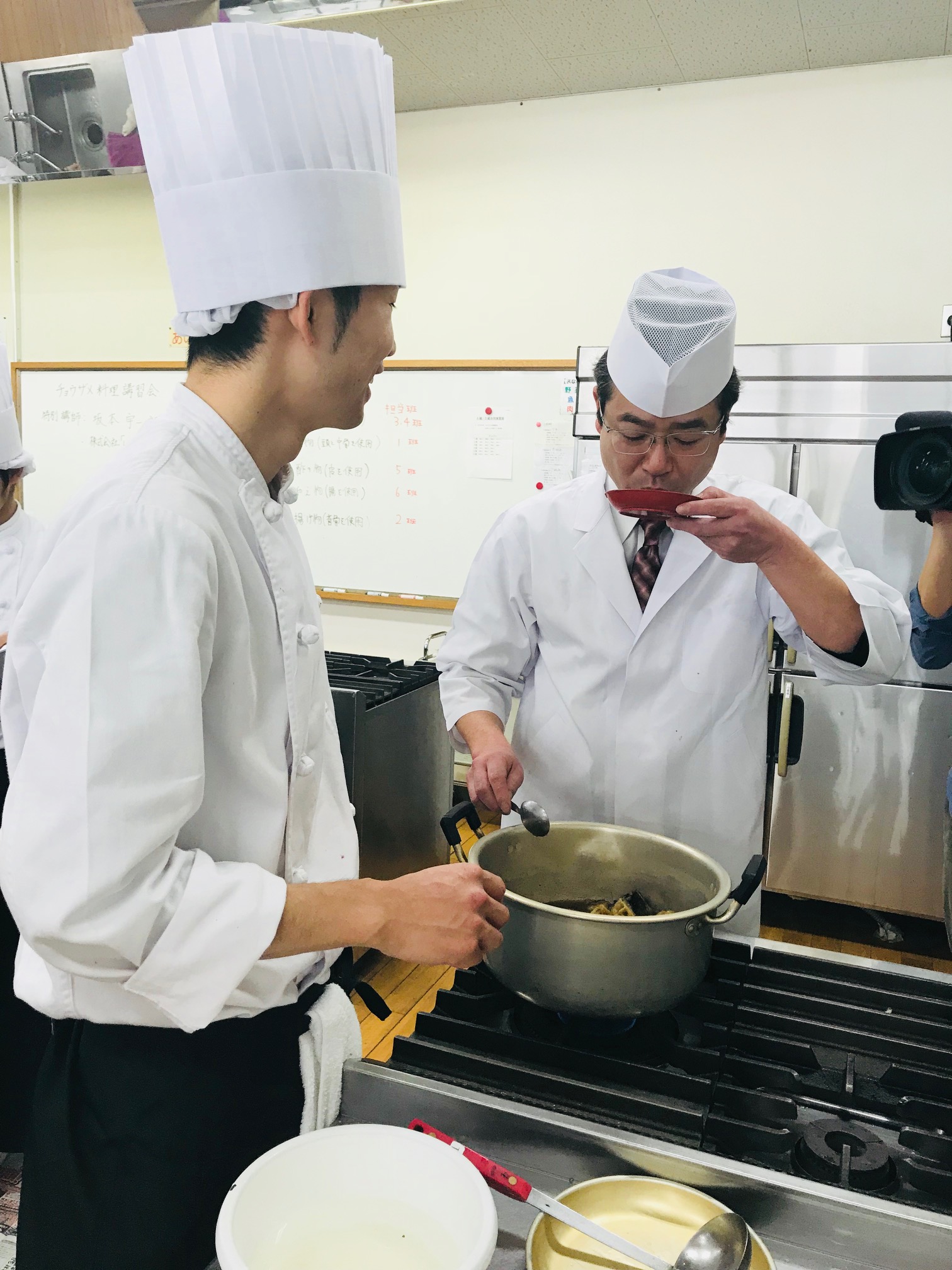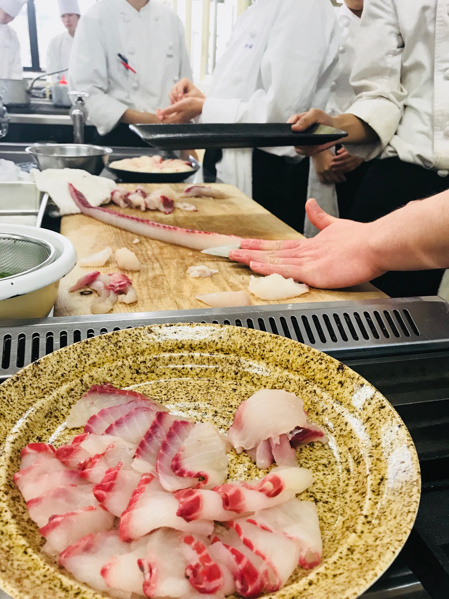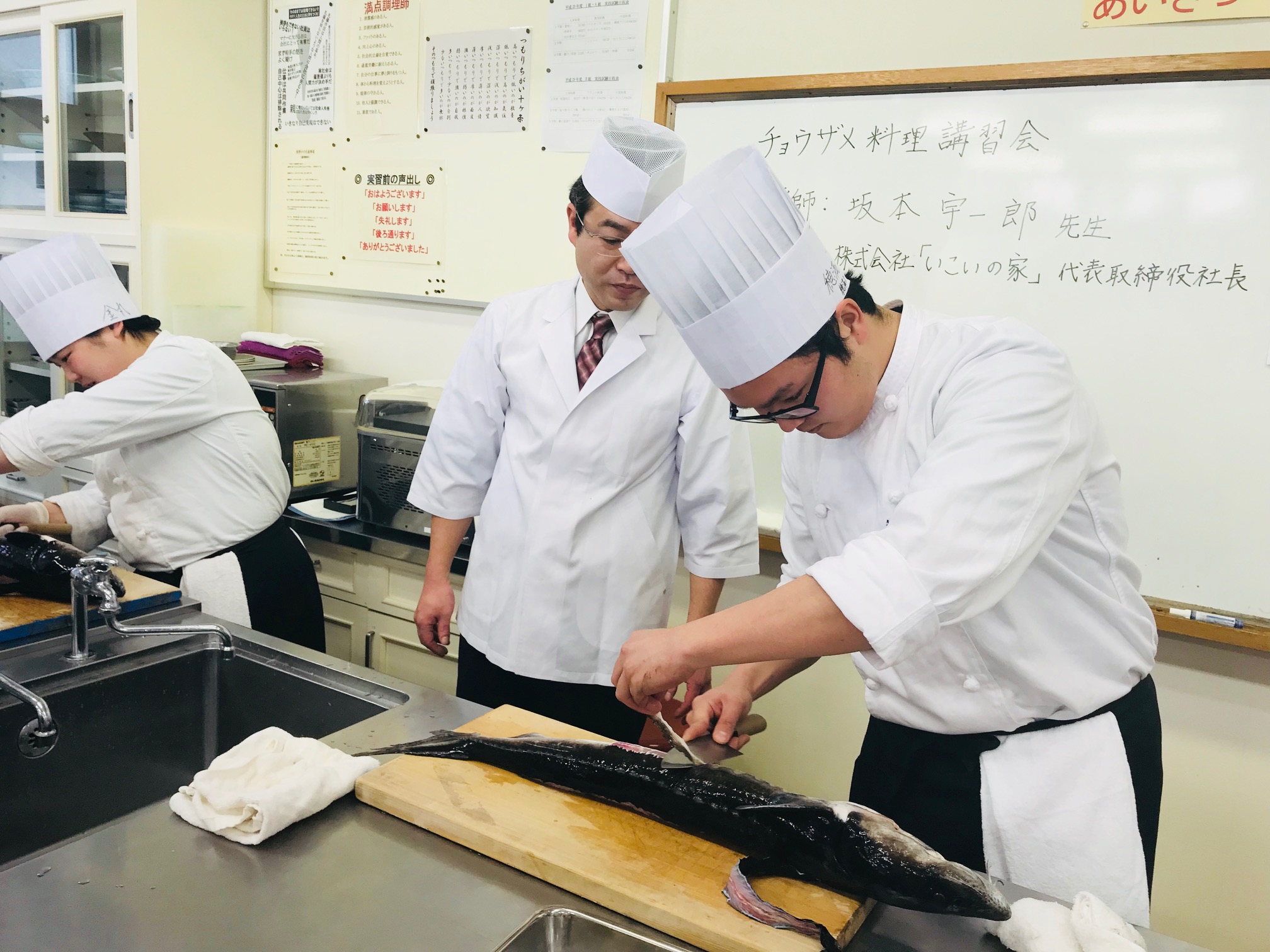 2月15日(木)、チョウザメを使った特別料理講習会が当校で行われました。キャビアで有名なチョウザメですが、捌き方などを丁寧にレクチャーして頂き、その身を余すことなく調理しました!!身→『刺身』『握り寿司』皮→『酢の物』腸→『和え物』背骨→『揚げ物』頭、中骨→『煮物』この様子は同日のMRT「ニュースNext」で放送されました(^^)【特別講師】株式会社 いこいの家代表取締役社長 坂本 宇一郎 氏(平成10年度卒業生)