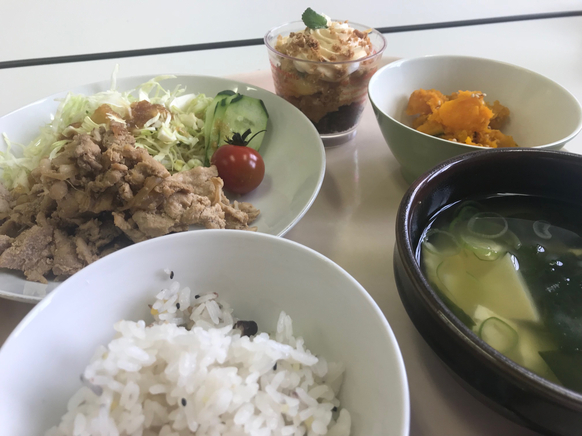 先週から今年度の給食が始まりました!本日のメニューは「豚肉の生姜焼き」、「かぼちゃの甘辛蒸し」、「竹の子と豆腐の味噌汁」、「雑穀ご飯」、「ミニパフェ」でした。