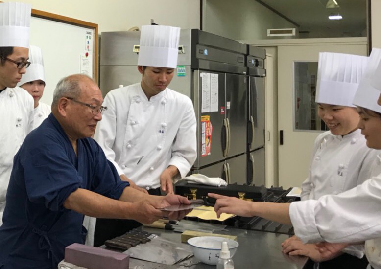 6月5日(火) 伝統工芸士・味岡知行氏を迎えて包丁の授業を行いました。包丁の研ぎ方・維持・管理の仕方・歴史を学びました。学生達は真剣そのもので、調理人の命ともされる包丁の奥深さを肌で感じていました!