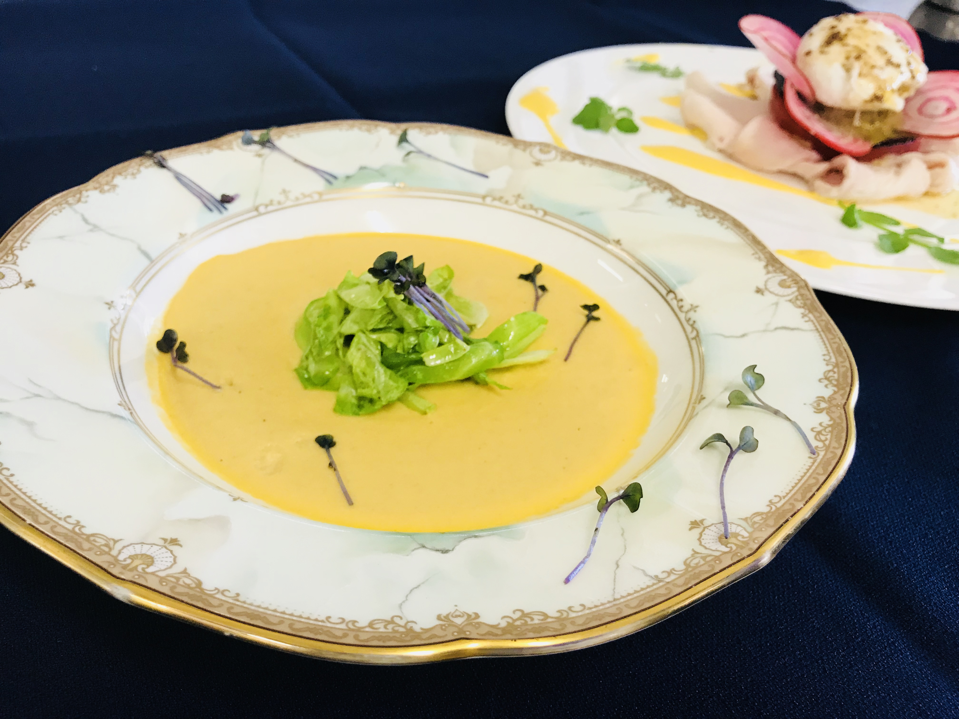 調理師専攻科2年生のフランス料理です。メニューは「卵のポシェと鶏ムネ、トマトサンド かぼちゃソース」、「春キャベツのフラン入りコンソメスープ」です(^^)