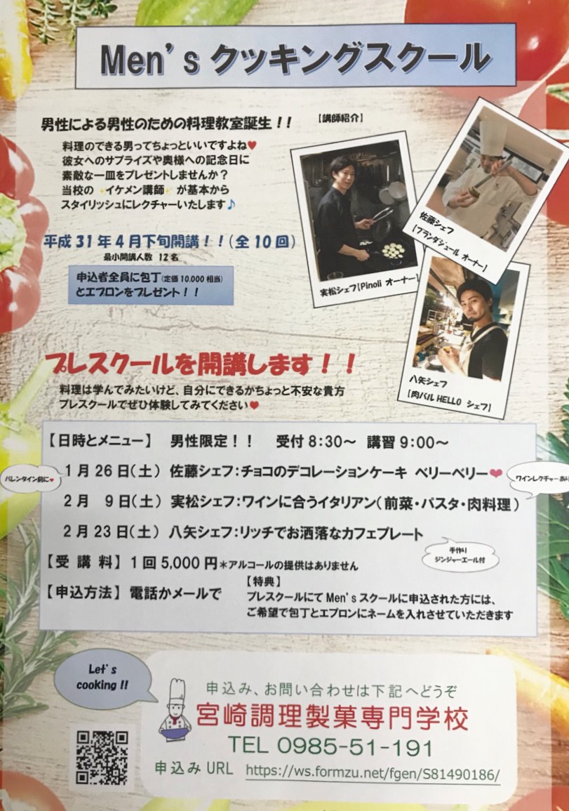 平成31年4月より「男性による男性のための料理教室!」と題して、『Men’sクッキングスクール』を開講予定!