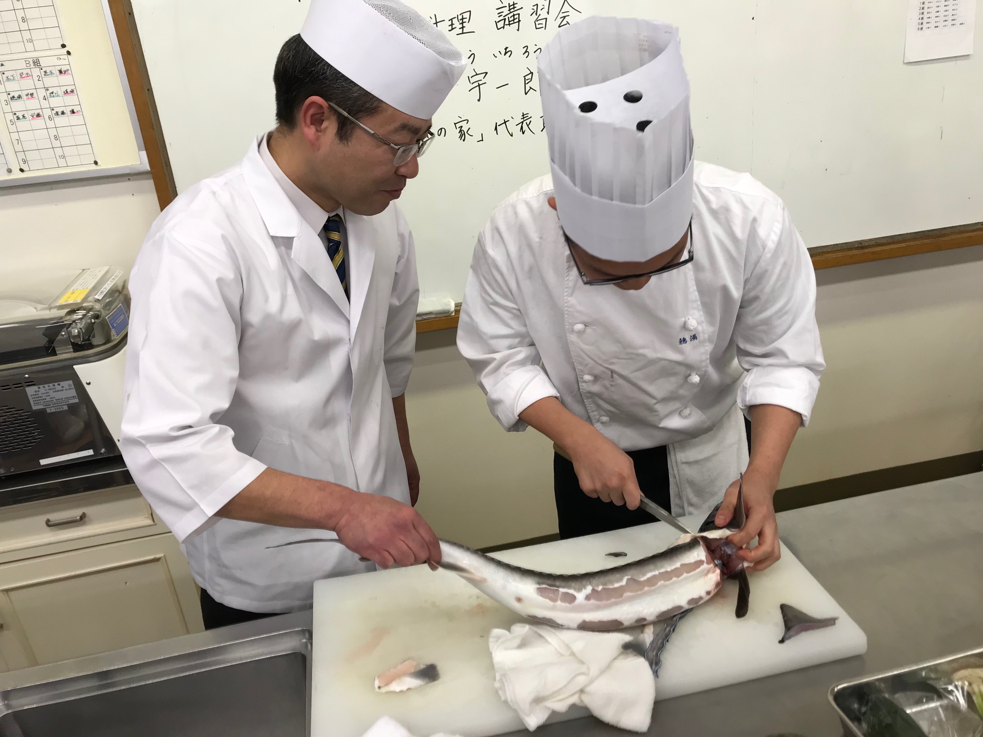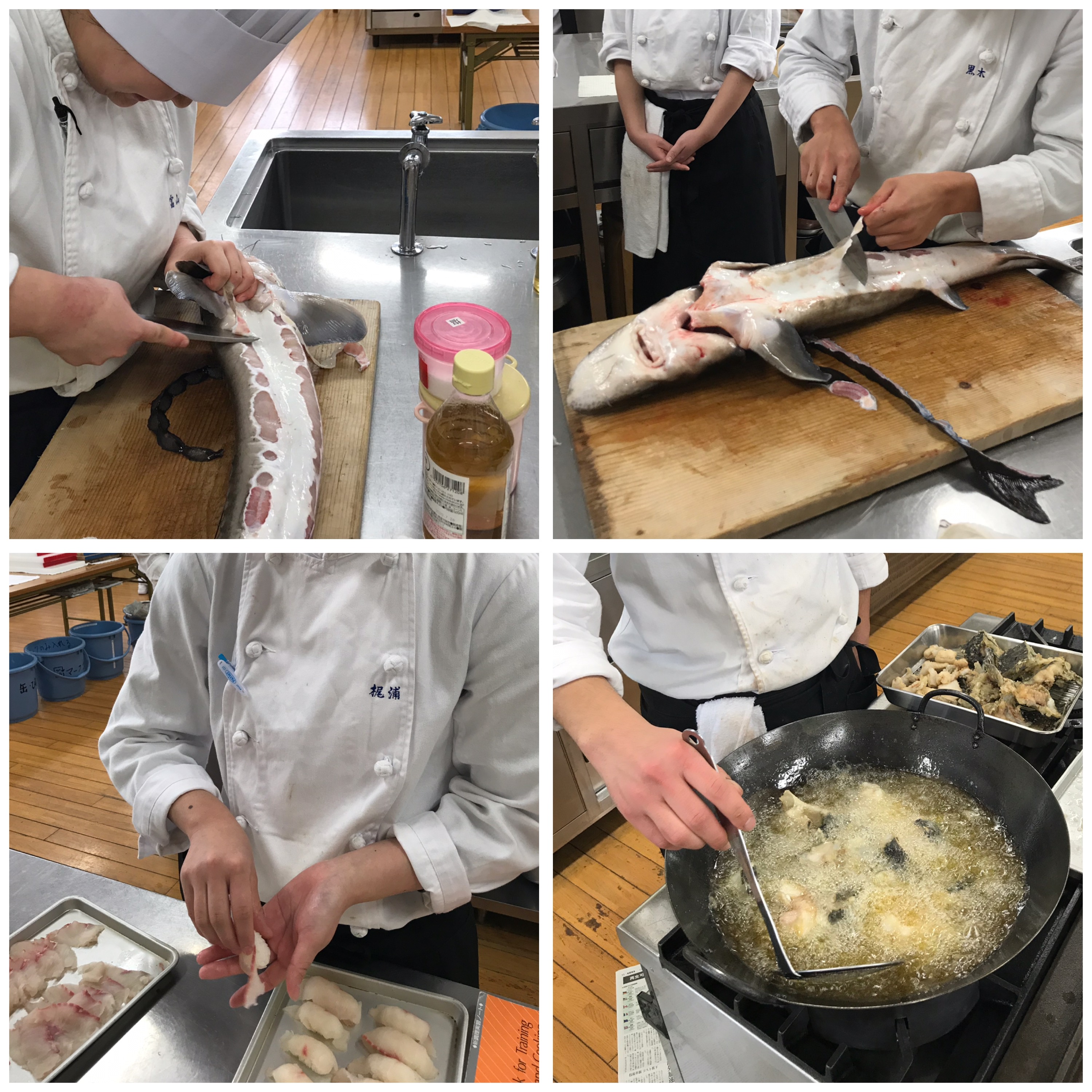 2月14日(木)、チョウザメを使った特別授業を当校で行いました。高級食材キャビアで知られるチョウザメを1匹丸ごと捌き、その身や皮を余すことなく調理しました!!身→『刺身』『握り寿司』皮→『酢の物』腸→『和え物』背骨→『揚げ物』頭、中骨→『煮物』【特別講師】株式会社 いこいの家代表取締役社長 坂本 宇一郎 氏(平成10年度卒業生)