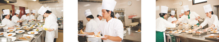前菜からメインディッシュ、デザートまでフルコースを本格的な厨房で実践!細かにコミュニケーションをとりながら自分の役割をしっかりと果たして、最高の一皿を作りましょう。